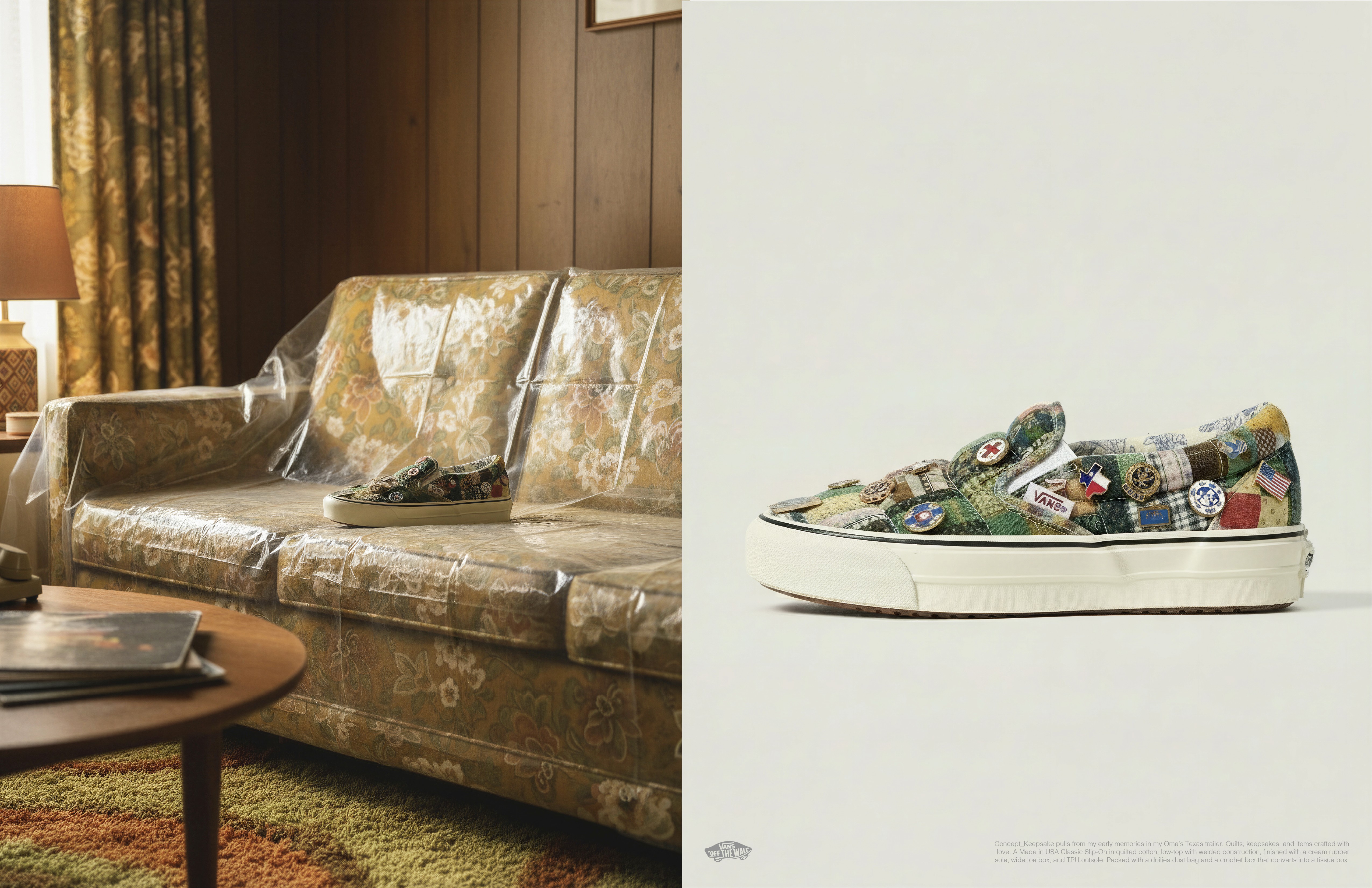 Using Vans’ iconic silhouettes as a vehicle for storytelling, this series treats each shoe as a canvas for memory, culture, and layered reference points. Personal in origin but broader in perspective, the work draws from family history, found artifacts, music, automotive nostalgia, and skate heritage to create objects that feel both familiar and reimagined. More than product, each concept is designed to carry narrative, emotion, and a distinct point of view. Vans_Long Haul: One weekend, I was at the park with my daughter in West Hollywood when a beautifully kept baby-blue Porsche 912 caught our attention. What stayed with me most was not just the car itself, but the beaded seat covers inside, a small nostalgic detail that made it feel more human, approachable, and lived-in. After digging deeper, I learned those covers were rooted in utility, famously used by cab drivers and long-haul truckers for airflow and comfort during long hours on the road. That tension between function and charm became the creative spark: I paired the idea with Vans’ archival Style 29, a silhouette that carried a similar duality, then merged the wood-bead reference with Vans’ iconic checkerboard language to create something that felt both familiar and reimagined. Vans_Keepsakes A reflection on the quiet, formative influence of my grandmother, whose creativity, curiosity, and care shaped the way I see design. Inspired by the handmade objects, rituals, and memories that filled her world, the concept explores how everyday keepsakes can carry deep emotional weight. It’s a tribute to the idea that the most meaningful design often begins with intention, craft, and a personal point of view.
